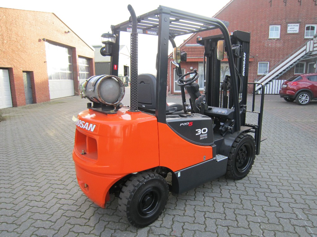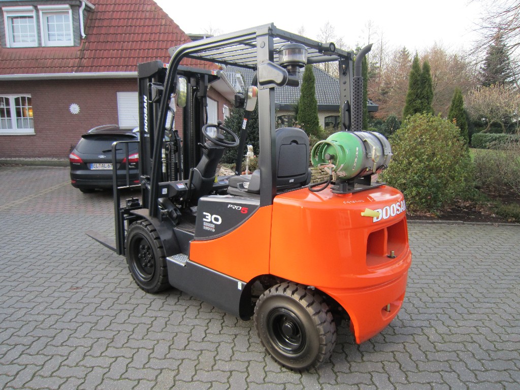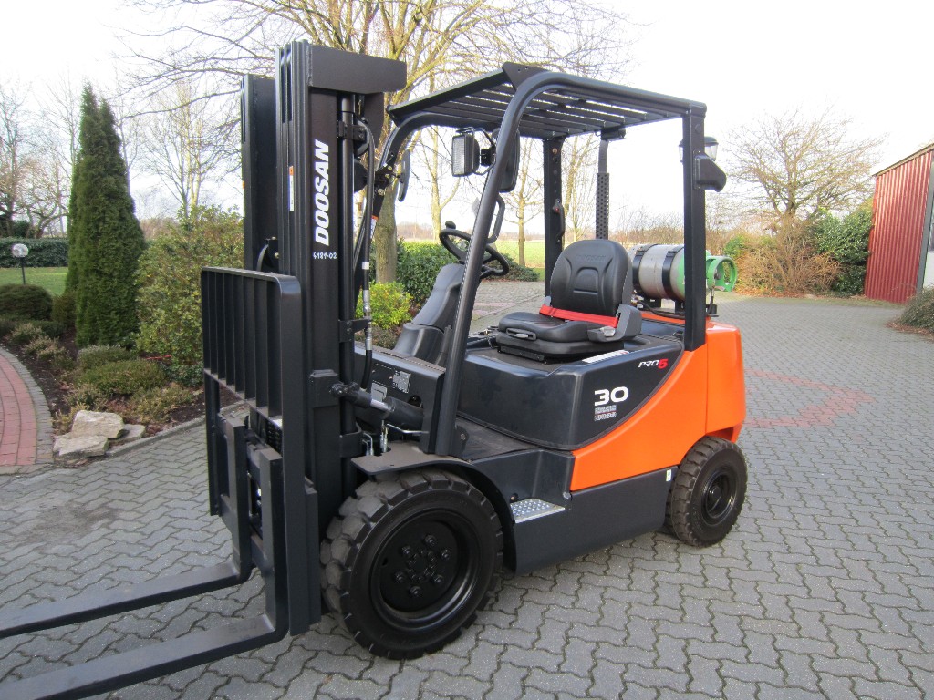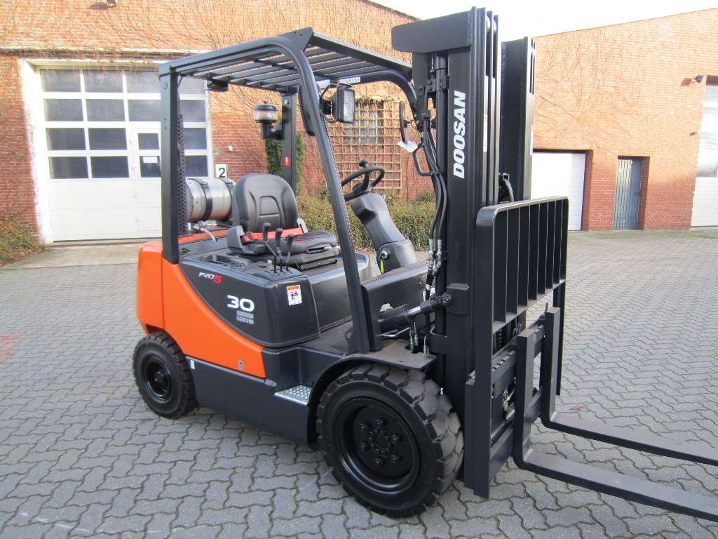 Doosan G30, 4- und 6-fach bereifte Treibgasstapler mit einer Tragkraft von 3,0 Tonnen. SE- oder nicht-kreidende SE-Bereifung optional erhältlich.