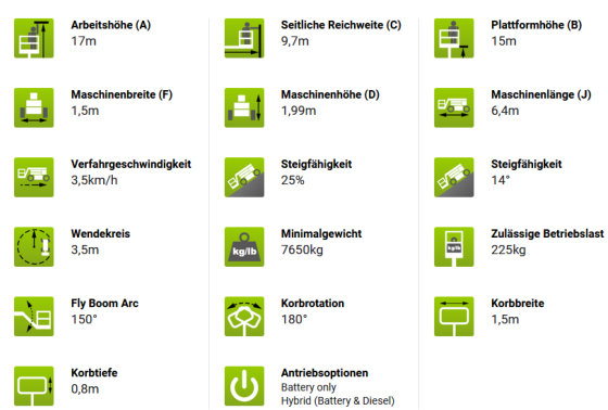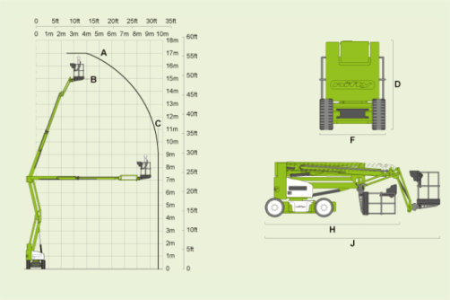 Mit der neuen Height Rider 17N (HR17N) können 2 Personen mit ihren Werkzeugen in einer Höhe von 17m oder bei einer seitlichen Reichweite von bis zu 9,7m arbeiten. Die nützliche 180° Korbrotation und der Korbarm gekoppelt mit den vollproportionalen multifunktionalen Steuerungen bieten Präzision beim Positionieren und machen so das Erledigen von Aufgaben einfacher und schneller.