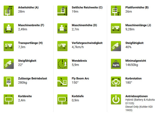 Die Height Rider 28 (HR28) Hybrid Vierradantrieb (4x4) ist eine der neuen Generation der umweltbewussten Arbeitsbühnen von Niftylift. Die Kombination aus fortschrittlicher Stromquellentechnologie und effizientem 4x4-Antrieb gibt ihr herausragende Leistung aus einem kompakten und leichtgewichtigen Design.