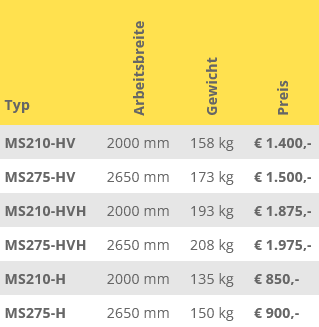 - Ausgestattet mit Verschleissgummi (MS210: 30 mm Dicke, MS275: 35 mm Dicke)