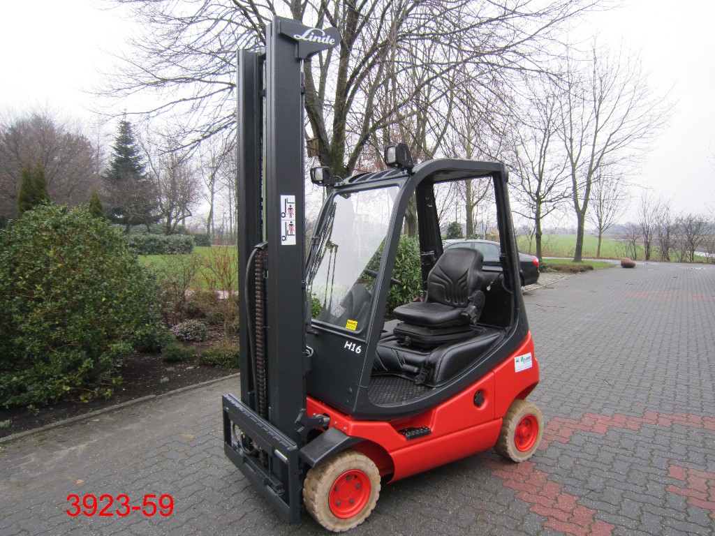 Linde H16D, 4- und 6-fach bereifte Dieselstapler mit einer Tragkraft von 1,6 Tonnen. Ohne Getriebe, Trommelbremsen, Kupplung und Differential arbeitet die original Linde Hydrostatik, das verursacht eine hohe Verfügbarkeit, eine gesteigerte Umschlagleistung sowie niedrige Servicekosten.