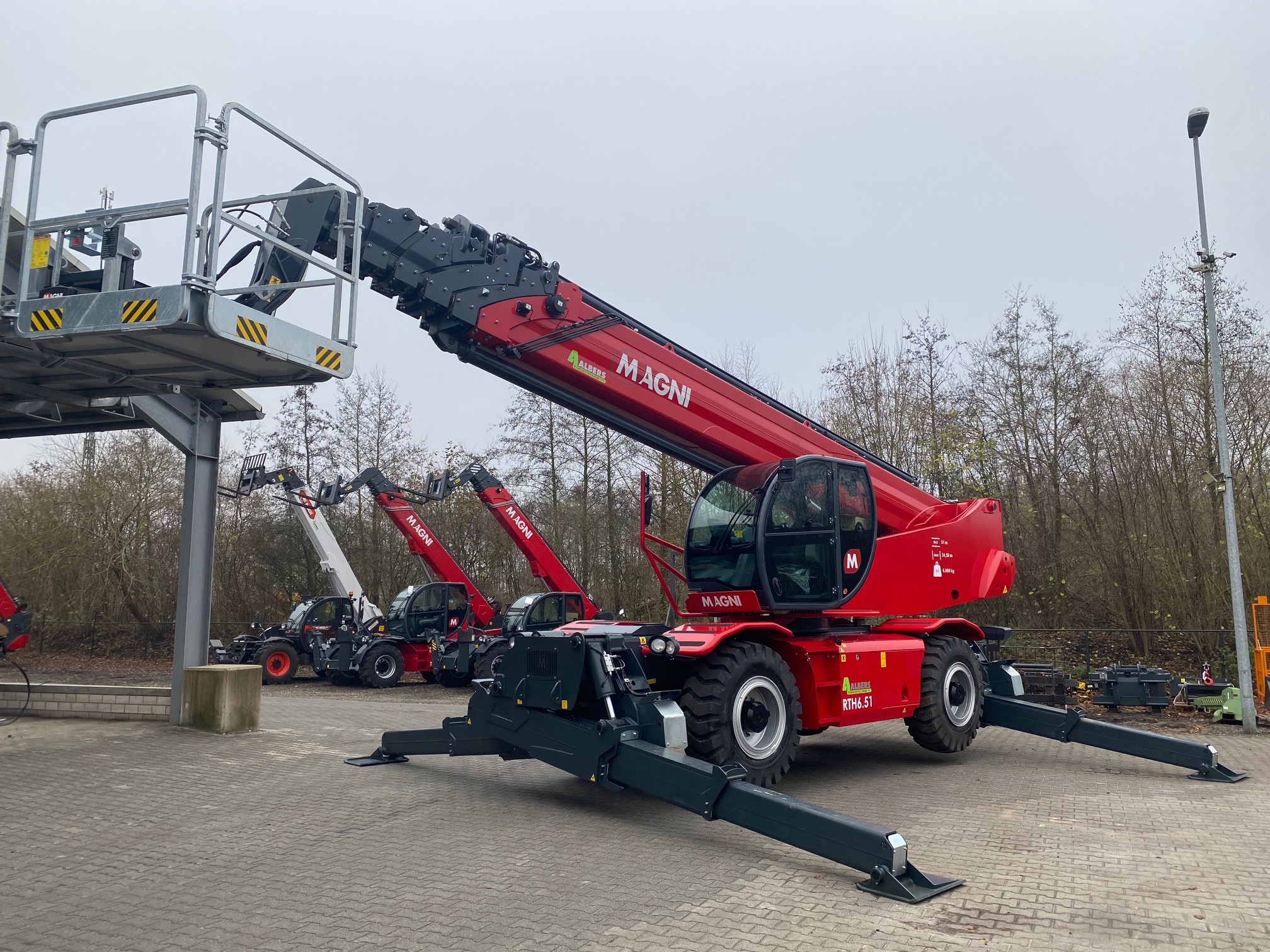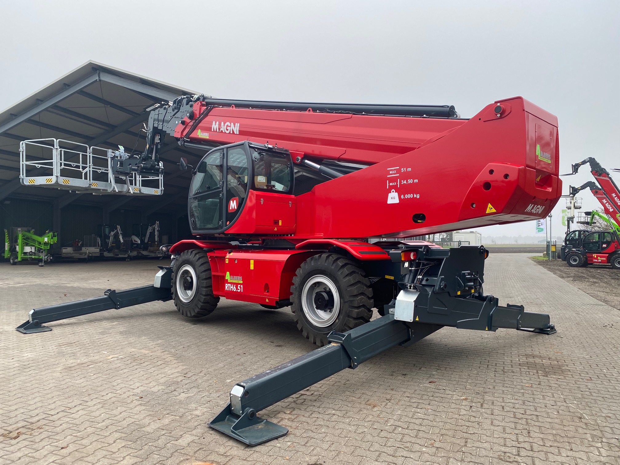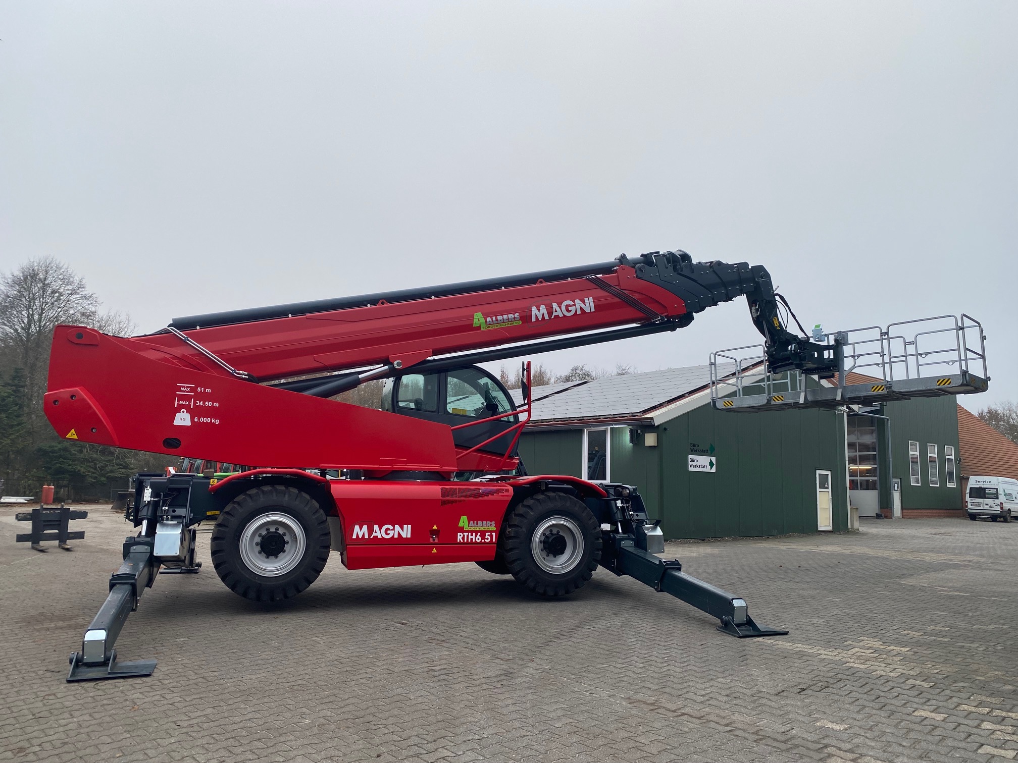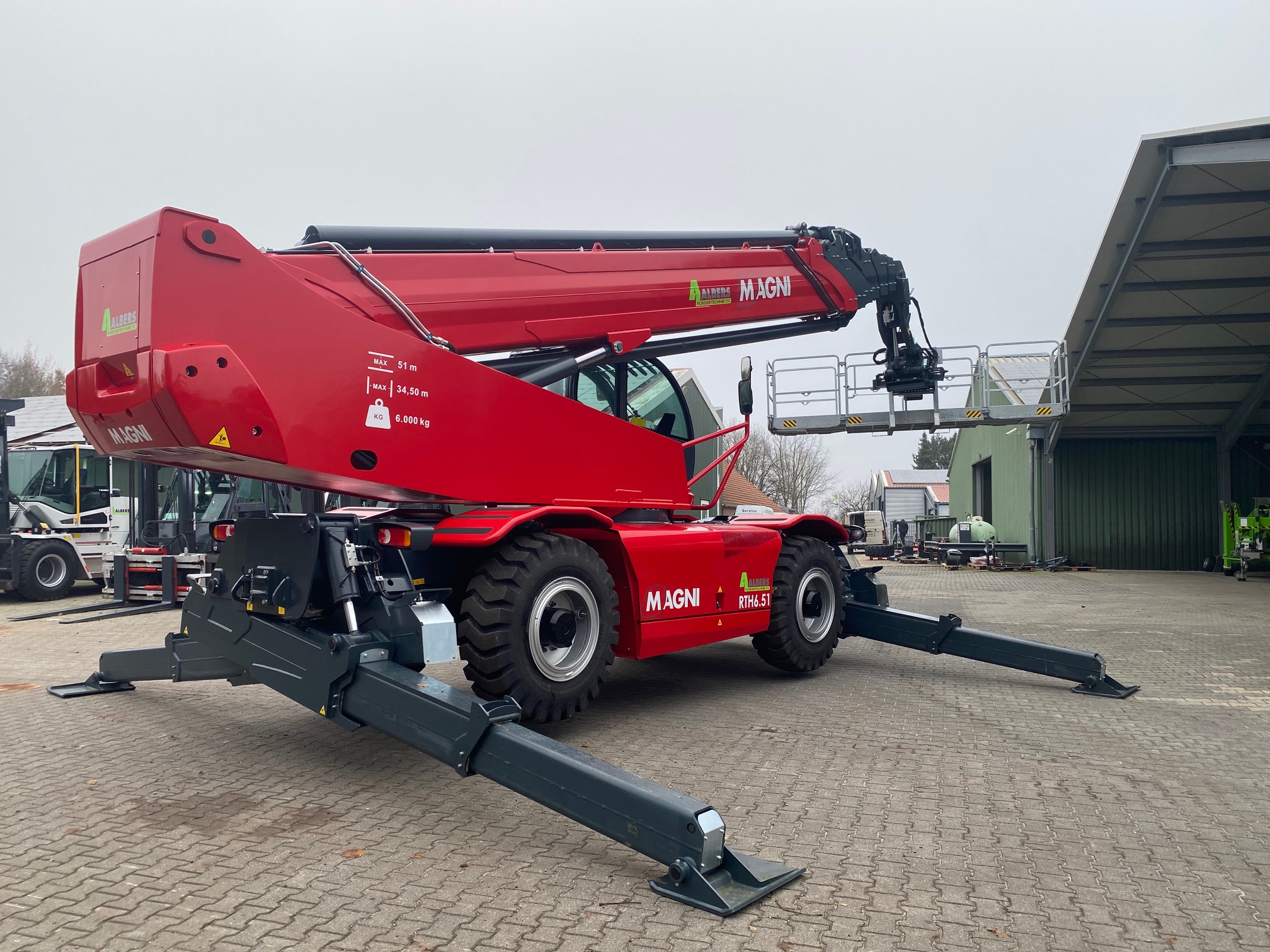 Der Teleskopstapler Magni RTH 6.51 ist mit einer Hubhöhe von 51000 mm der drehbare Teleskopstapler mit der größten Arbeitshöhe auf der ganzen Welt. Das Gerät kann bis zu 6000 kg heben und ist mit Scherenstützen mit Doppelausschub ausgestattet. Der Magni RTH 6.51 ist mit zwei unterschiedlichen Arbeitsmodi für die Anbaugeräte ausgerüstet: Strenght Mode M2 und Stability Mode M1. Der Strenght Mode M2 ermöglicht den Schwerlastumschlag bei begrenzter Reichweite, der Stability Mode M1 kann mit einer größeren Reichweiten dafür aber nur mit einer geringeren Last arbeiten. Durch eine Vielzahl von erhältlichen Anbaugeräten kann der Magni RTH 6.51 zu den unterschiedlichsten Einsätzen genutzt werden.