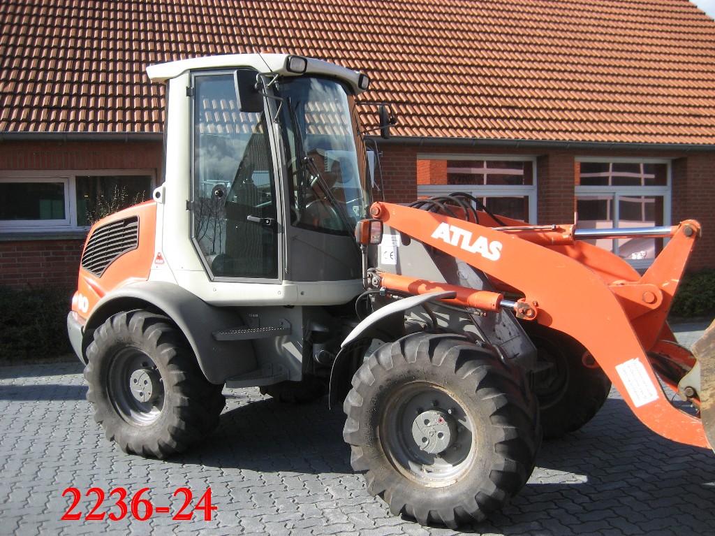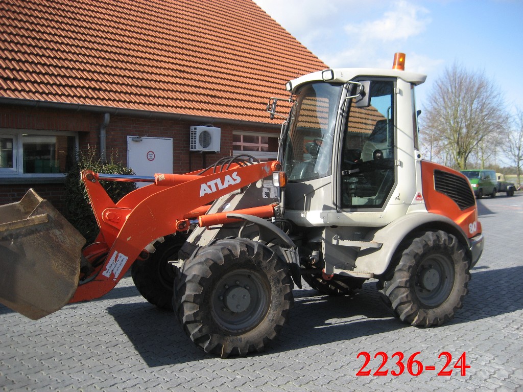 Radlader Atlas AR 80 mit hydrostatischem Fahrantrieb, Regelfahrmotor unter Last schaltbar, Allradantrieb, mit einer Tragkraft von 3,1 t und einer Hubhöhe von 3,19 m.
