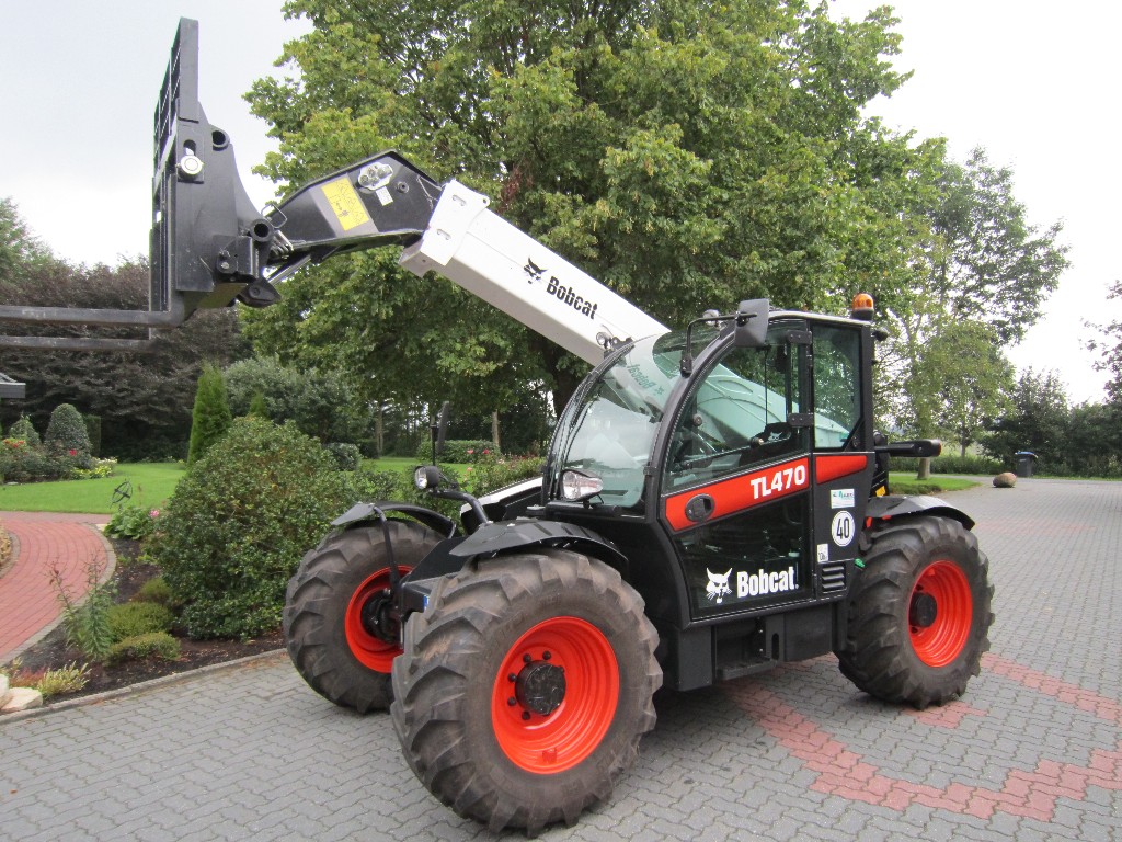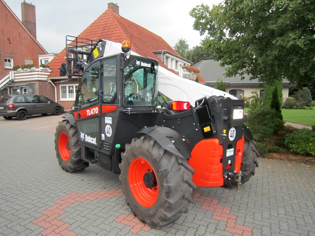 Teleskopstapler Bobcat TL 470, durch seine zahlreich erhältlichen Anbaugeräte (Serienmäßig ausgestattet mit mechanischer Verriegelung für Anbaugeräte) ist die Maschine vielseitig einsetzbar, mit einer Tragkraft von 3,5 t und einer Hubhöhe von 6,957 m. ![]()